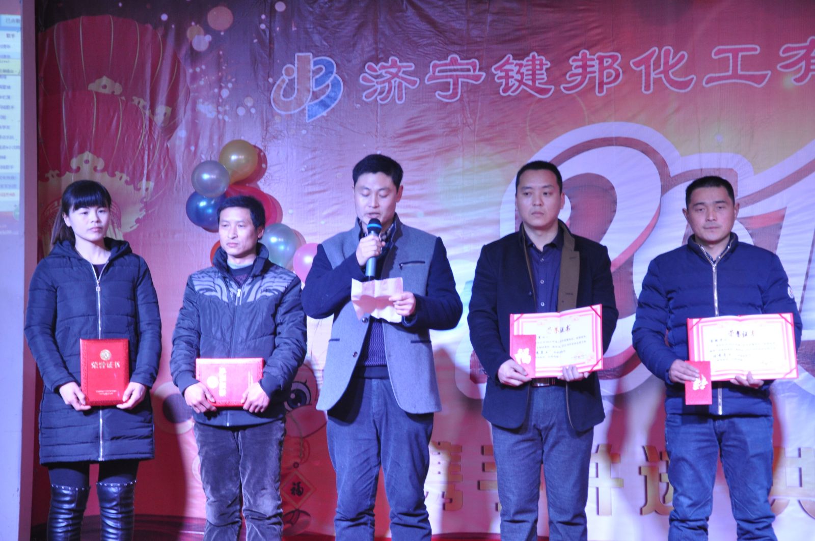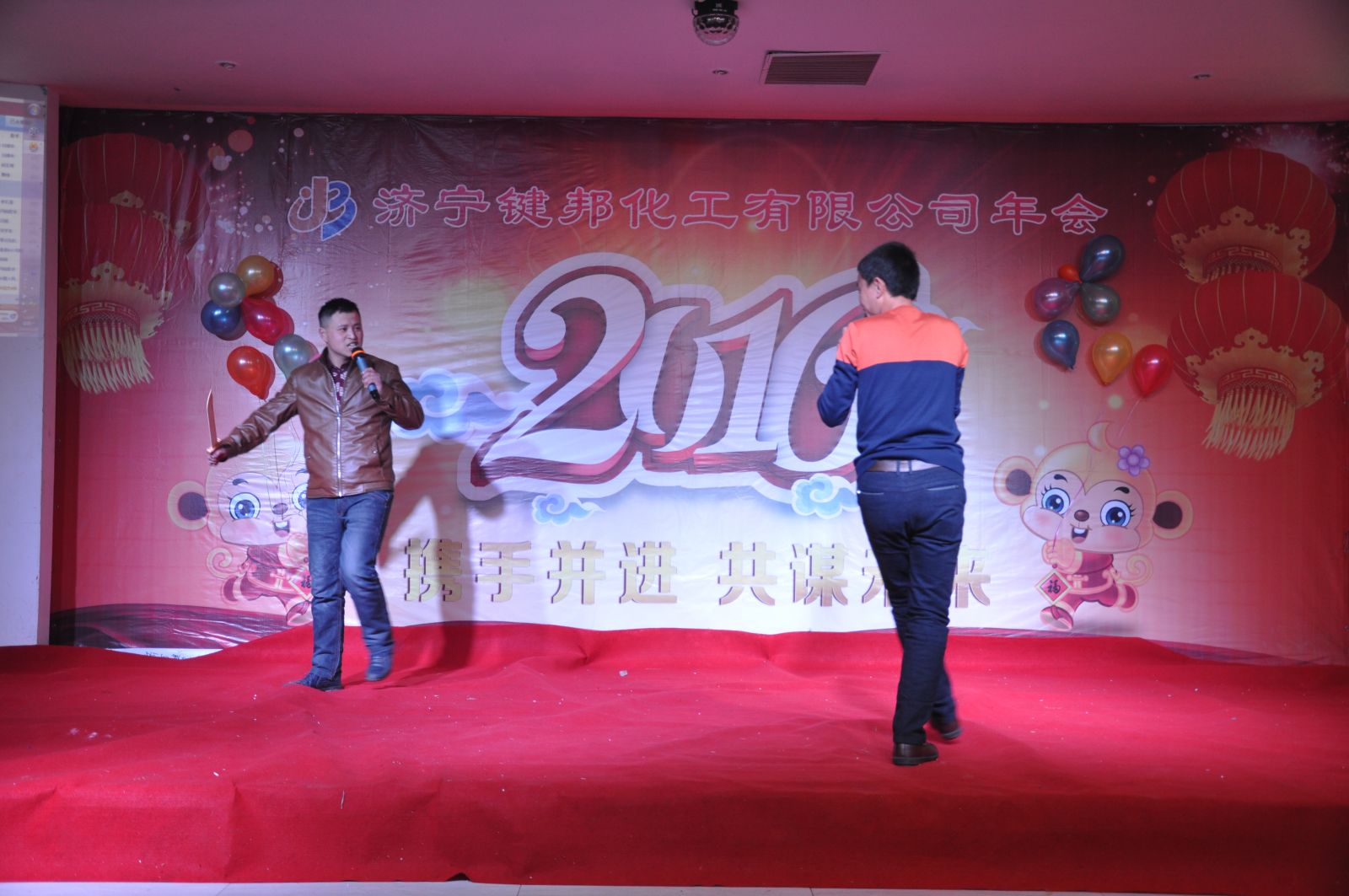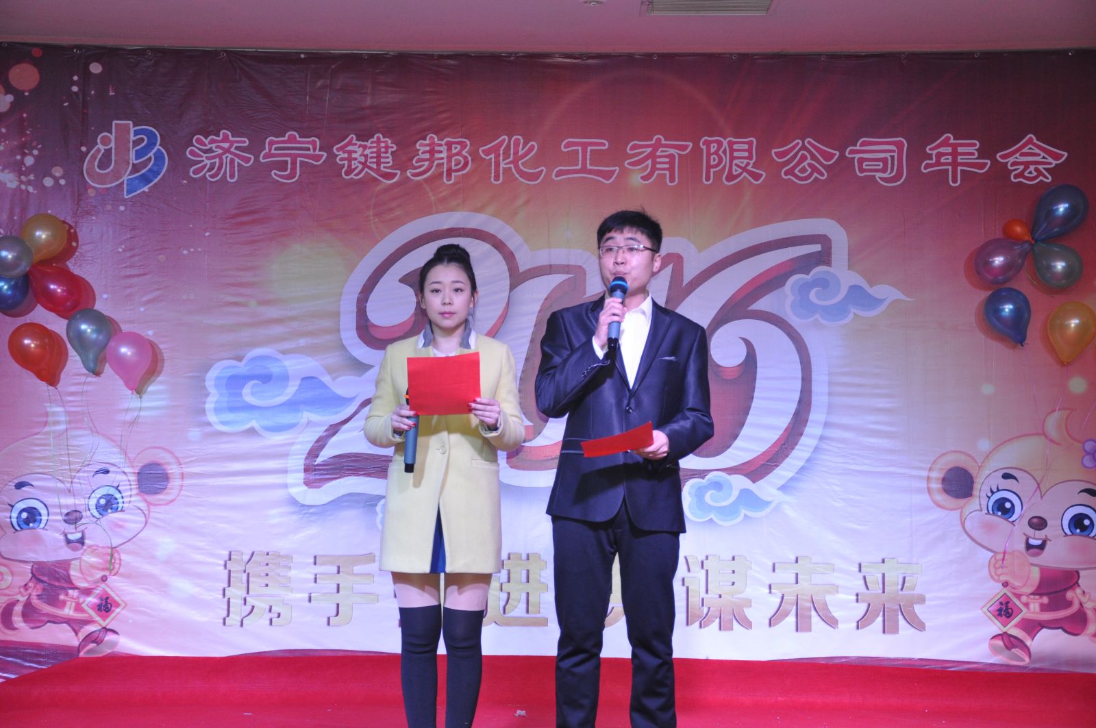 金猴起舞传福音,键邦团聚迎新春!2016年1月30日中午, 伴着飘舞的雪花,济宁键邦化工有限公司全体员工欢聚一堂,举行了隆重的公司第一次年会。会上表彰了2015年度“十佳”优秀员工,公司总经理回顾总结了成绩卓著的2015年,同时提出了新的目标,希望全体员工团结协作,共同开创键邦化工更加辉煌的2016!年会上,公司员工还自编自导了一台娱乐节目,深情的献唱、精彩的小品、鼓舞人心的演讲、声情并茂的朗诵等等,给大家展示了键邦人的积极向上的精神面貌,穿插进行的抽奖环节更是将年会推向了高潮。希望在全体键邦人的努力下,创造更加辉煌、更加灿烂的2016!