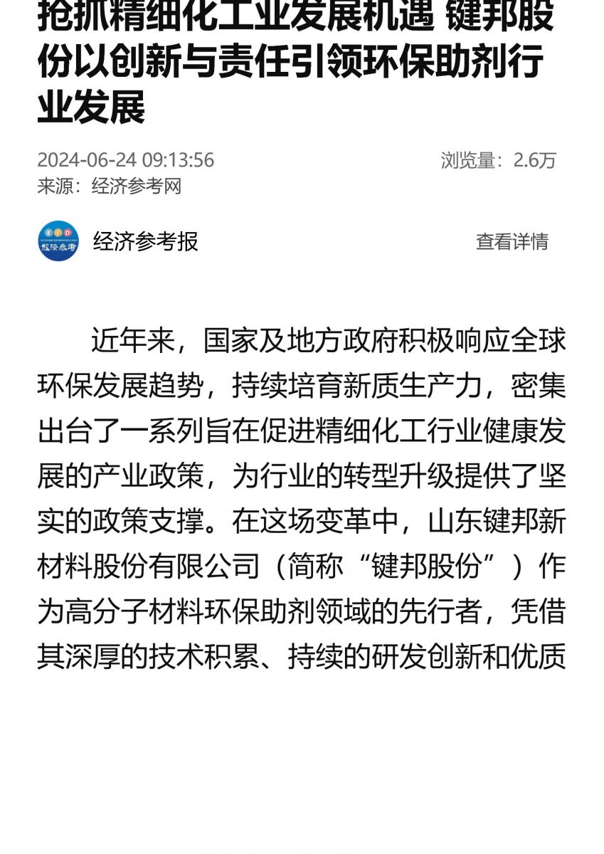 抢抓精细化工业发展机遇 键邦股份以创新与责任引领环保助剂行业发展